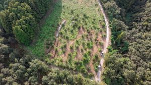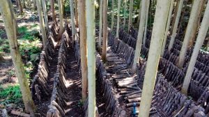 下の写真をご覧ください。山の斜面に帯状に組まれているのが、椎茸の菌を植え付けた原木です。 (10本のライン状のものです)