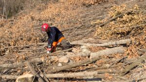 伐採した木を一本ずつ適切な長さに切り揃えていくこの工程は、原木栽培の土台となる大切な仕事です。冬の澄んだ空気の中、乱雑だった山が少しずつ整理され、整然と原木が積み上がっていく様子には、この仕事ならではの清々しさがあります。